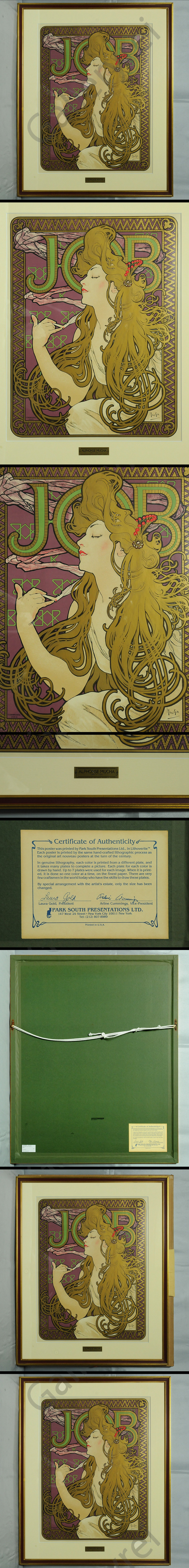 「ジョブ」はタバコの巻紙の商品名です。タバコそのものではなく、その巻紙の宣伝ポスターです。商品の宣伝ポスターの場合、当然その商品が焦点となるが、タバコの巻紙では、絵にならない。そこでミュシャが選んだのは、ジョブで巻いたタバコを吸い、陶然となる美女であった。ミュシャ好みの美女であるが、ある意味でここの主役は「ラ・プリュム」誌版アート・ポスター「サラ・ベルナール」以上に強調された波打つロングヘアーである。